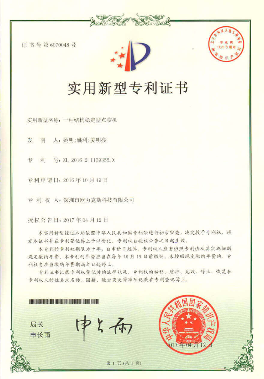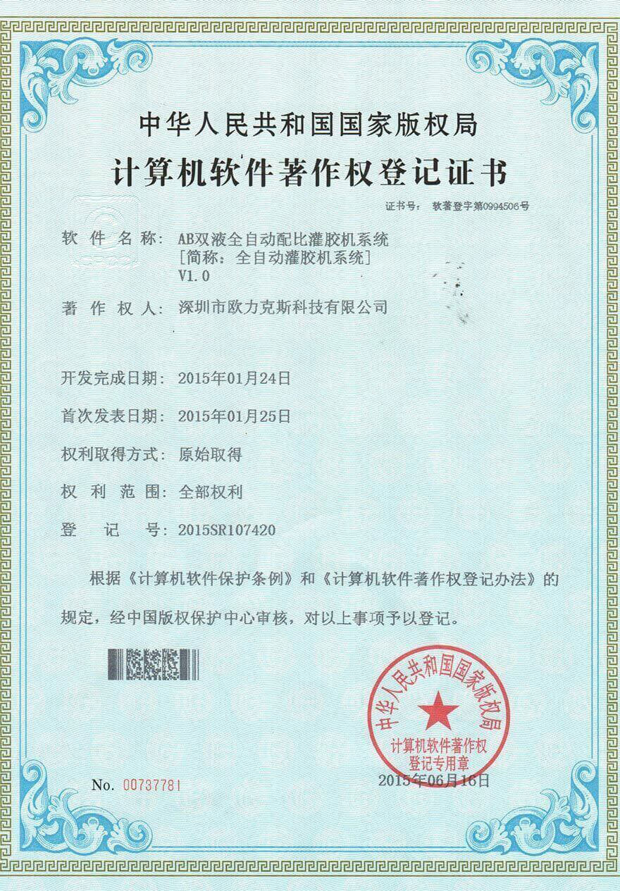 全自动螺丝机系统登记证书