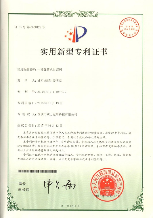旋转式出胶阀专利证书