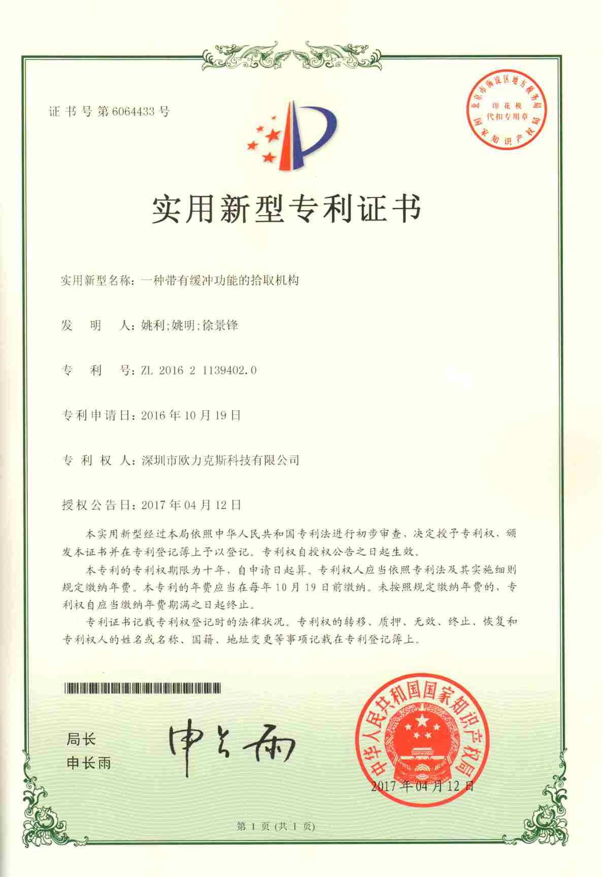 带有缓冲功能的拾取机构专利证书